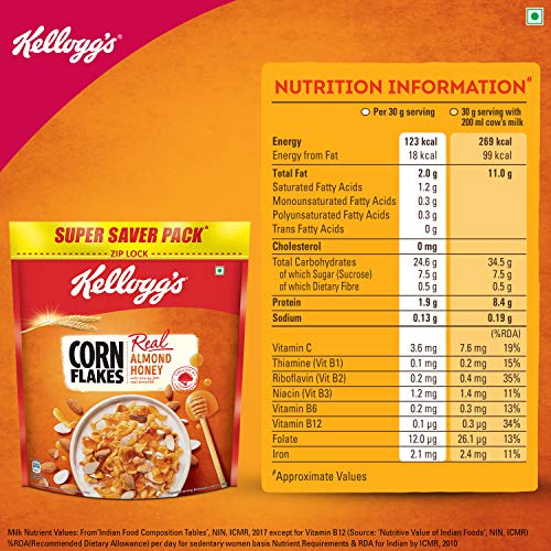 Kellogg’s Corn Flakes with Real Almond is a tasty, nourishing and wholesome breakfast at its very best. The goodness of almond inclusions with real honey can be tasted in every bite. Kellogg’s Corn Flakes cereal is a nourishing and wholesome breakfast at its very best. Naturally Cholesterol Free, High in Iron, Vitamin C, B group Vitamins (B1, B2, B3, B6)