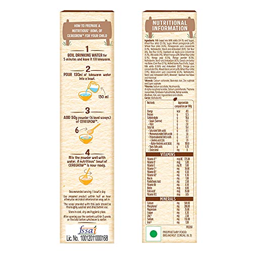 Ceregrow is a nutritious cereal with the goodness of muligrain, milk & fruits designed to meet the nutritional needs of your li’l one. It’s packed with nourishment and benefit of 16 vitamins & minerals to help support the normalphysical growth & development of the child. CEREGROW is a rich source of Iron that helps in normal cognitive development. Crafted for your li’l one, it has Immuno-nutrientslike Vitamin A, C, D, Iron & Zinc which help support normal immune system function.